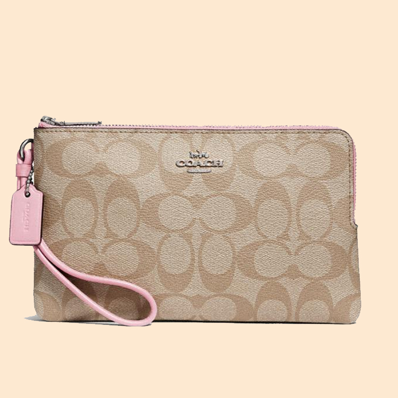 Coach Double Zip Wallet Signature Light Khaki Carnation