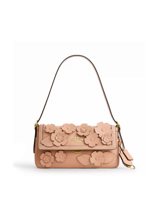 Coach Etta Small Flap Shoulder Bag With Floral Applique Gold Light Pink