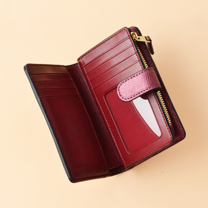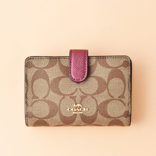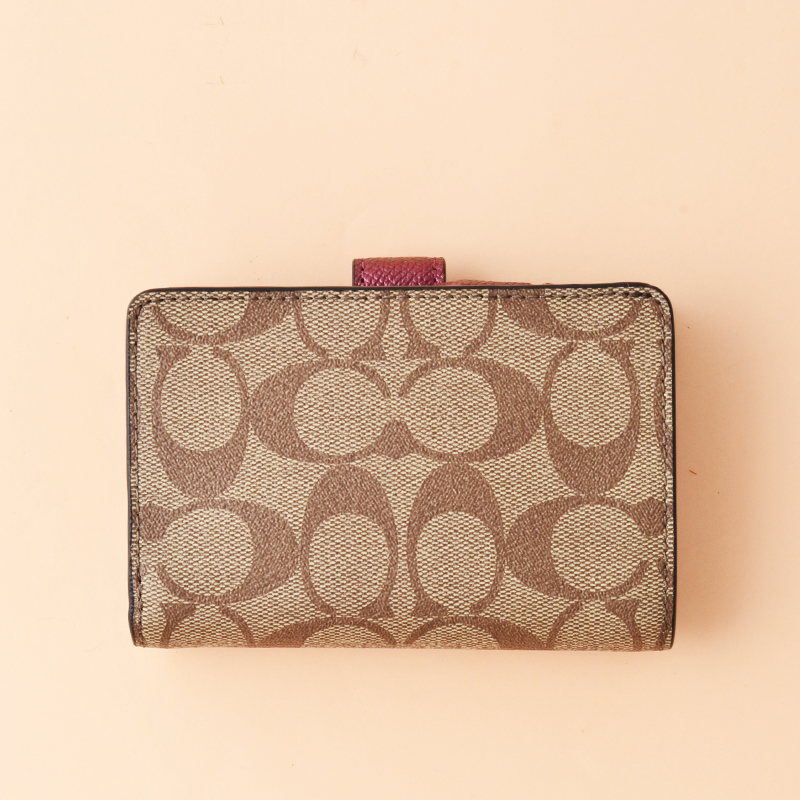 Coach Medium Corner Zip Wallet Signature Khaki Metallic Wine