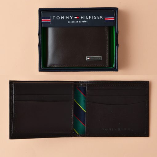 Tommy Hilfiger Men’s Leather Passcase Wallet Brown Plaque