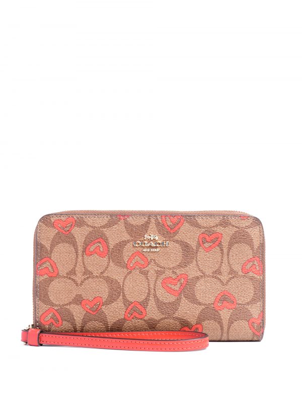 Coach Large Phone Wallet Crayon Hearts Print Signature Khaki Red Multi