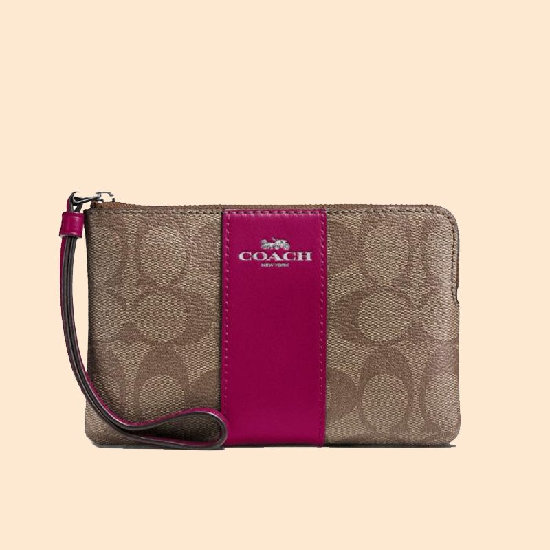 Coach Corner Zip Wristlet Signature Khaki Dark Fuchsia