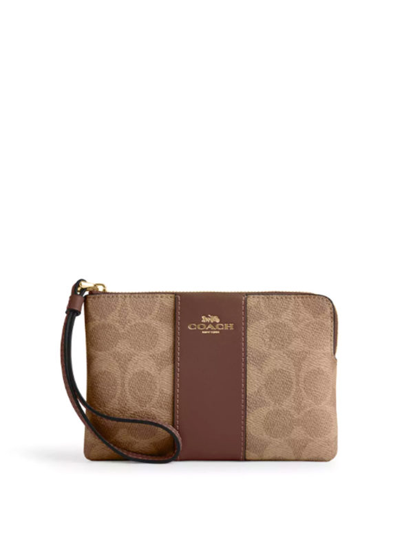 Coach Corner Zip Wristlet Signature Tan Brown